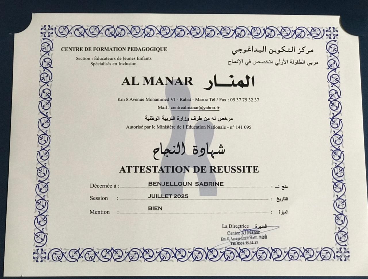 Bonjour, je m’appelle Sabrine Benjelloun et je suis passionnée par l’accompagnement des enfants. Après avoir travaillé comme maîtresse remplaçante en école maternelle et suivi une formation spécialisée en éducation de la petite enfance, j’ai choisi de mettre mon expérience au service des familles, en tant que nounou à domicile. ???? Ce que je propose : Un environnement sûr, bienveillant et stimulant pour vos enfants. Des activités adaptées à chaque âge : jeux éducatifs, lecture, activités manuelles, éveil et motricité. Aide aux devoirs, apprentissages ludiques et accompagnement scolaire. Soins quotidiens : repas équilibrés, bain, hygiène et organisation de la journée. Flexibilité : garde à temps plein ou partiel, aide ponctuelle, accompagnement à l’école ou activités extrascolaires. ✅ Pourquoi me choisir ? Pédagogie et patience issues de mon expérience en classe. Capacité à gérer un groupe d’enfants comme à apporter une attention personnalisée. Communication fluide avec les parents pour assurer un suivi régulier. Sérieuse, responsable et impliquée : vos enfants sont ma priorité. ???? Basée à Marrakech, je suis disponible dès maintenant pour accompagner vos enfants au quotidien. J’ai hâte de rencontrer votre famille et de contribuer à l’épanouissement de vos enfants. Lire plus