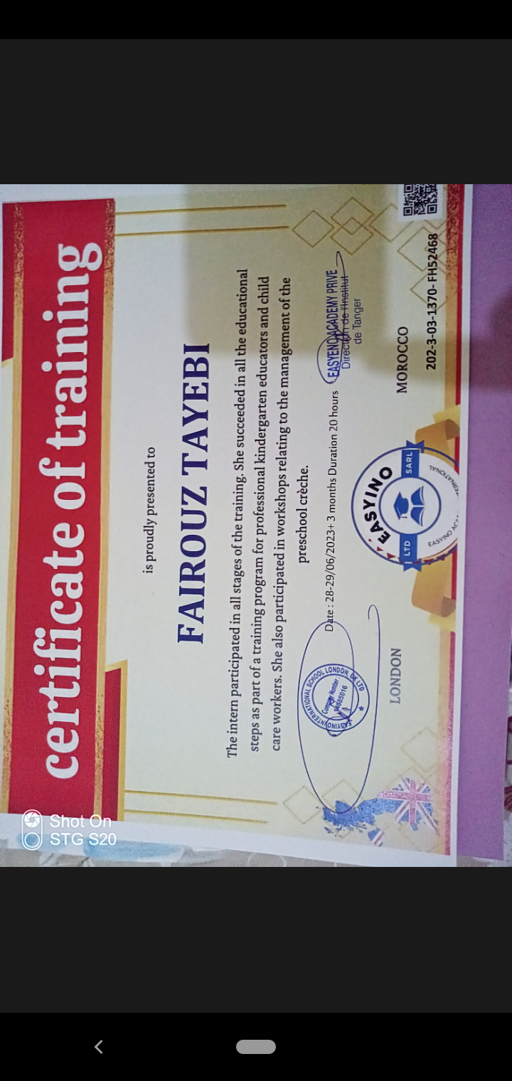 Bonjour, je m'appelle Fayrouz, je suis originaire de la ville de Tanger. Je suis une personne gentille et compatissante. Je porte des responsabilités envers les enfants et je les aime. J'aime mon travail.Lire plus