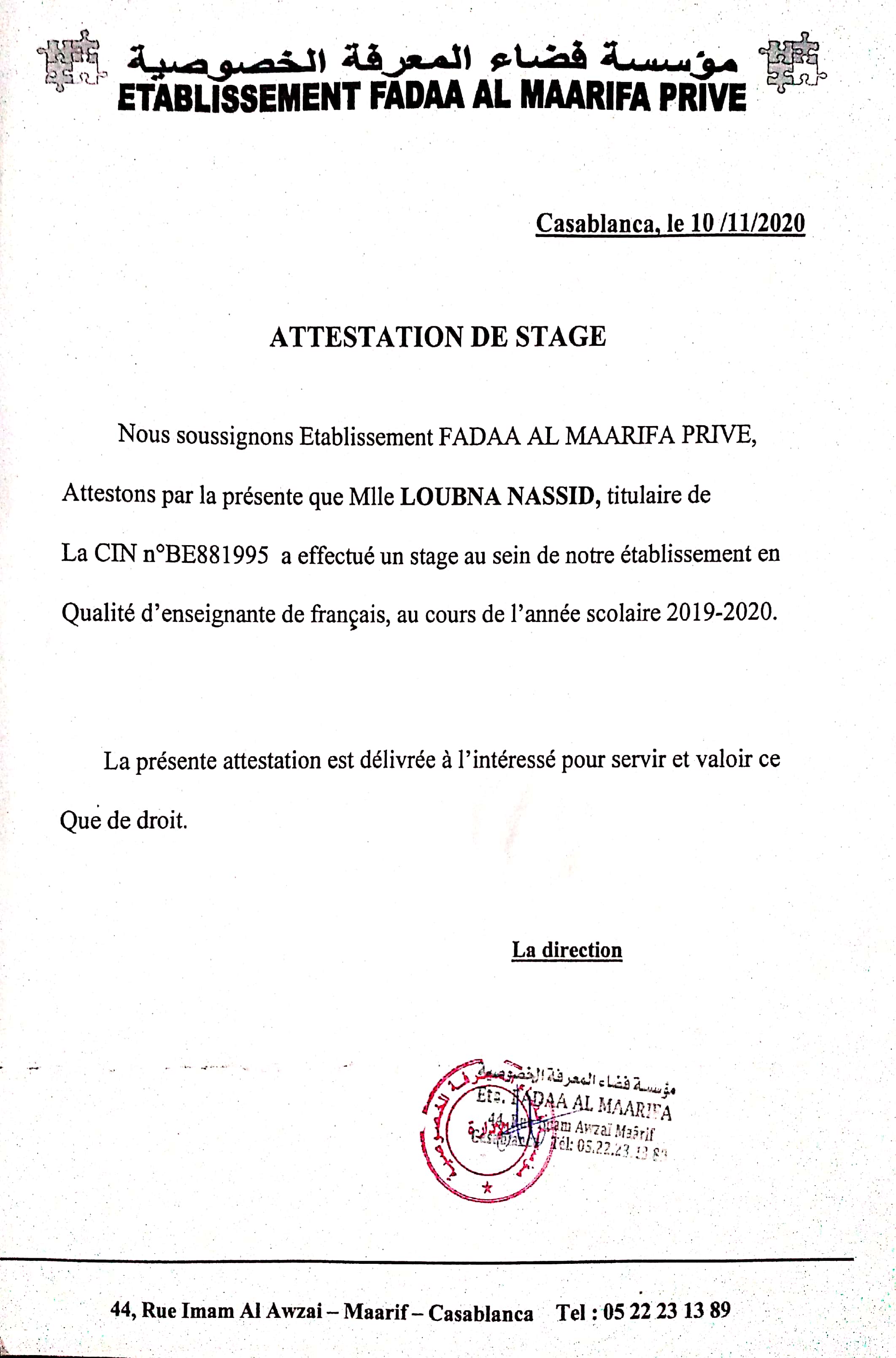 Loubna peut vous fournir sur demande les coordonnées d'anciens employeurs qui la recommandent.